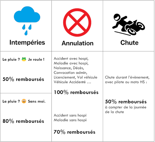 ![]() ATTENTION TOUTES CES ASSURANCES OPTIONNELLES SONT A SOUSCRIRE EN MEME TEMPS QUE VOTRE JOURNEE et au MINIMUM 3 semaines avant l'évènement. Toutes assurances souscritent moins de 3 semaines avant l'évènement ne pourront pas donner droit à remboursement. Si vous souhaitez souscrire cette assurance quelques jours après avoir commandé votre trackday, rendez vous sur le site de l'assureur : Assuracing Résumé des couvertures (entre autres) ![]() ANNULATION Cette assurance vous couvre dans les situations suivantes, entre autre, : Les annulations justifiées sont remboursées à 100% - Accident corporel de l'assuré avec hospitalisation (accident de circulation, sur circuit, domestique … avant le roulage) - Maladie de l'assuré avec hospitalisation - Accident ou maladie avec hospitalisation du conjoint, ascendant ou descendant jusqu’au 2nd degré - Décès du conjoint, ascendant ou descendant jusqu’au 2nd degré dans les 7 jours précédant la date de l'évènement garanti - Naissance d'un enfant de l'assuré survenant dans les 7 jours précédant la journée de roulage - Vol du véhicule engagé sur la journée de roulage - Convocation de l'assuré à un examen de rattrapage - Convocation de l'assuré en tant que juré d'assises ou témoin - Dommages matériels importants impactant le domicile de l'assuré ou ses locaux professionnels. - Immobilisation du véhicule engagé au roulage suite à un accident sur route ou sur circuit 1 mois avant le roulage et n'étant plus en état de fonctionnement, et dont le délai de réparation ne permet pas de participer à la journée de roulage - Perte d’emploi suite à un licenciement du salarié (CDI) - Changement de destination ou annulation du moyen de transport en commun Les annulations sont remboursées à 70% - Accident sans hospitalisation de l'assuré - Maladie sans hospitalistaion de l'assuré - Accident ou maladie avec hospitalisation du conjoint, ascendant ou descendant jusqu’au 2nd degré Tous les autres motifs ne sont pas remboursés 0% Exemple : je n’ai plus envie de rouler, ma belle-mère m’a convié à un repas de famille, j’ai mal au dos mais je n’ai pas vu de médecin, je dois travailler ce Dimanche mais je n’ai pas de justificatif … Pour obtenir votre remboursement : Vous pouvez contacter : - le plus rapide : en ligne sur le site de l'assureur : www.assuracing.com , onglet pilote / espace assuré - par mail : info@assuracing.com - par téléphone : 01 85 39 01 49 . ![]() Interruption suite à accident (Chute) Cette assurance vous couvre dans les situations suivantes : - Toute interruption suite à un accident contraignant le pilote à l’abandon de son roulage (véhicule ou pilote non opérationnel(s)). Le jour de l'interruption suite à un accident est considéré comme un jour sinistré. La garantie et la franchise s’appliquent sur l’ensemble des jours de roulage restant à réaliser, incluant le jour de chute. Exemple : roulage de 3 jours à 300 € avec chute le jour 1 : remboursement de 50% de 300 € = 150 €. Pensez à ramener votre pass d’accès à la piste (autocollant de la moto) pour que l’on puisse confirmer que vous n’avez pas repris la piste. Sans ce retour, vous ne pourrez pas avoir votre remboursement. Pour obtenir votre remboursement : Vous pouvez contacter : - le plus rapide : en ligne sur le site de l'assureur : www.assuracing.com , onglet pilote / espace assuré - par mail : info@assuracing.com - par téléphone : 01 85 39 01 49 . ![]() Garantie Pluie (Intempéries) Cette assurance vous couvre en cas de pluie. 2 situations sont possible : - Vous avez roulez sur cette journée = Remboursement à 50% - Vous n'avezpas pris la pistede la journée = Remboursement à80% Attention, pour pouvoir justifier que vous n'avez pas pris la piste de la journée, il faut que nous ayons votre pass de groupe entre les mains. Donc vous ne devez pas avoir pris votre enveloppe le matin ou vous devez nous ramener votre pass de groupe avant 09h00. Pour obtenir votre remboursement : Vous pouvez contacter : - le plus rapide : en ligne sur le site de l'assureur : www.assuracing.com , onglet pilote / espace assuré - par mail : info@assuracing.com - par téléphone : 01 85 39 01 49 . Notice d'information Cancel-R Document Informatif de l'assurance Annulation Fiche d'information préalable de l'assurance Annulation |